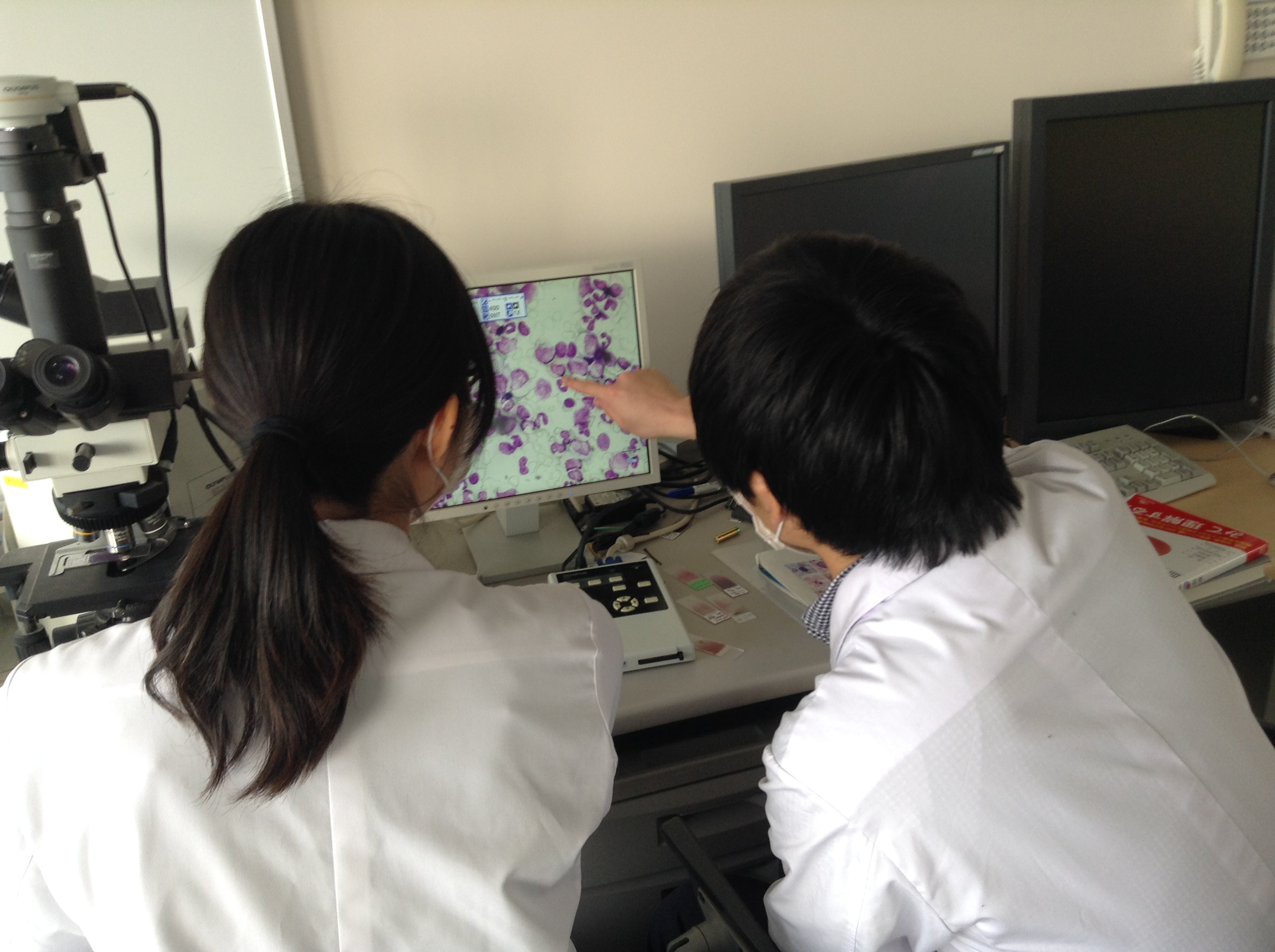 実際の実習では、一人のスタッフの下で、2-3人の患者さんを担当として診察し、「主治医」の一人として実習をしてもらいます。血液内科は、抗がん剤を扱うだけでなく、全身管理、感染症の治療など、総合内科医としての知識が必要な分野です。従って、抗生剤、抗ウイルス剤、輸血、輸液の管理を学ぶこともできます。